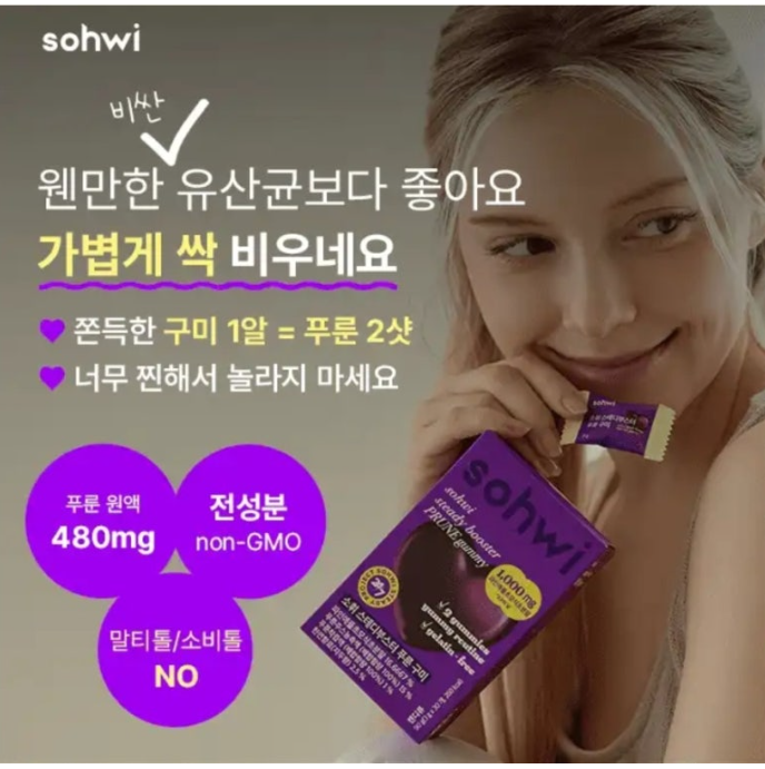 "이거 먹고 내성있는 변비약 완전 끊었어요" 구미 1알에 푸룬 2샷 찐하게 꽉 채워 싹 밀어내거든요. 자꾸 조기 소진되어 죄송해요 2차물량까지 완판 소휘 푸룬 구미는 설사를 유발하는 인위적인 D-소비톨, 쓸데없는 당, 칼로리 싹 빼고 <천연 소비톨과 식이섬유가 풍부한 푸룬 OO의 함유량>만 쫙 높여 내성없는 루틴템으로 완성했어요. 여기서 OO은?