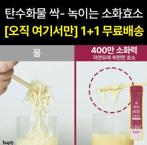 탄수화물 많이 먹는 한국인들! 바로 여기예요! 단 한 포로 탄수화물 싹 해결해드립니다! 해플리 곡물효소는 소화를 편안하게 만들어주는 효소로 정제효소, 인공첨가물 없이 오직 20가지 곡물로 만든 000만 역가수치를 보장하는 곡물효소입니다! 여기서 000에 들어갈 숫자를 써주세요!